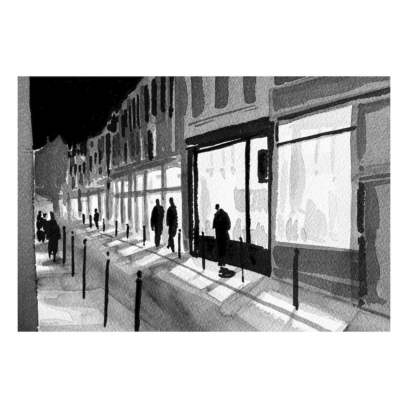 Après avoir choisi le lieu, je m'imprègne de sa présence, de sa lumière, de son silence. Sur place, un premier croquis naît. De retour à l'atelier, l'encre de chine ou l'aquarelle redonnent vie à ce souvenir. Mon geste tente alors de révéler la lumière cachée derrière l'émotion.